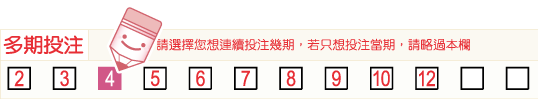 您可以利用選號單上的「多期投注」欄位,就該張選號單上的投注內容連續投注2~12期(含當期),如果您不想投注多期,則不需要填寫該欄。