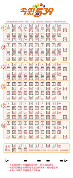 每張今彩539最多可劃記6組選號,每個選號區都設有39個號碼(01~39),您可以依照自己的喜好,自由選用以下幾種不同的方式填寫選號單,進行投注。