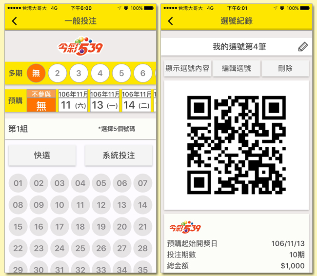 如果您的智慧型手機為iOS或Android之作業系統,您可先下載「台灣彩券」APP,並利用APP中的「我要選號」功能,填寫投注內容。每張電子選號單皆將產生一個QRcode,至投注站掃描該QR Code,即可自動印出彩券,付費後即完成交易。
